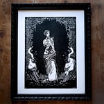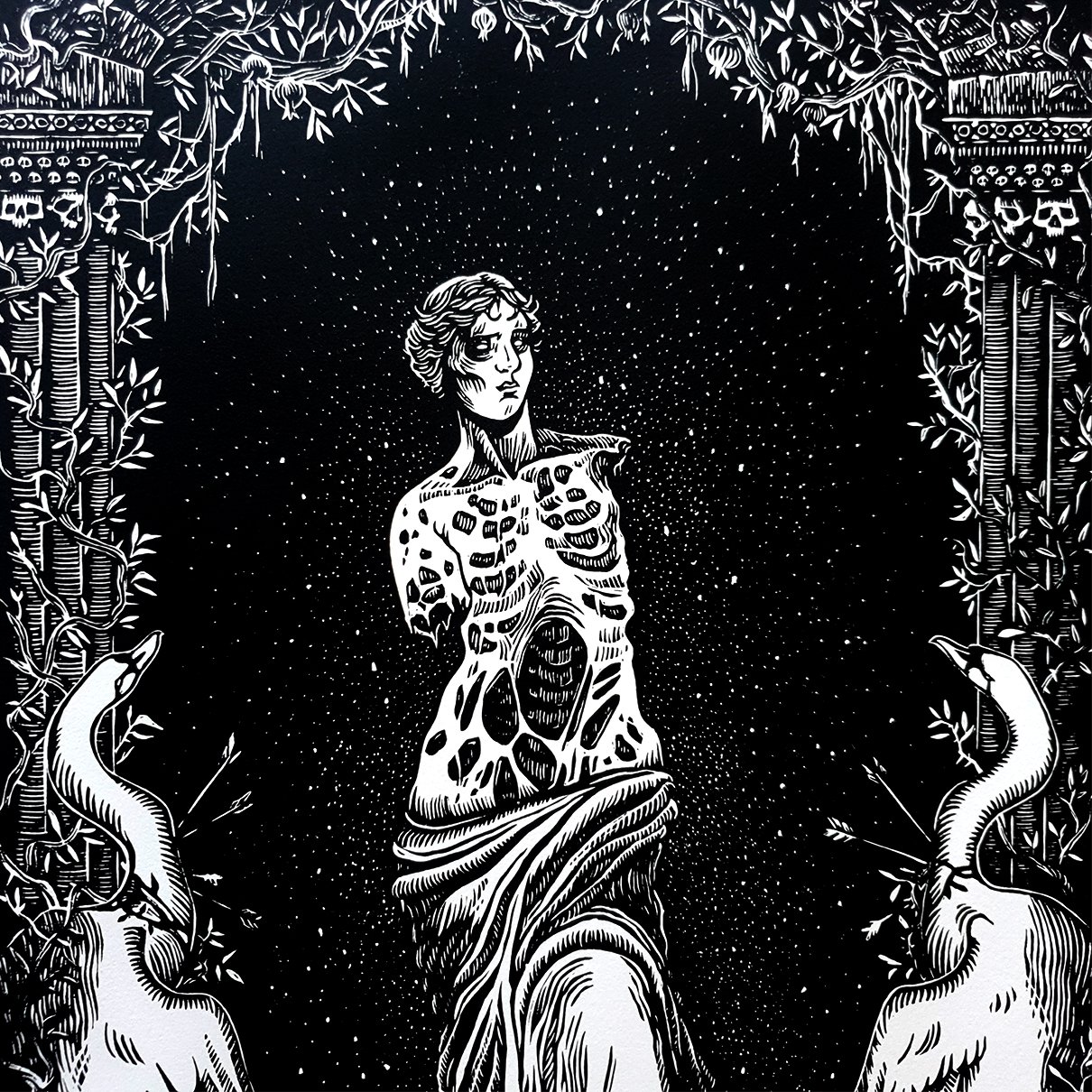 Réinterprétation de la Vénus de Milo, Aphrodite, entourée de ses symboles, les cygnes, les grenades, les rosiers montants, dans une version plus décharnée.