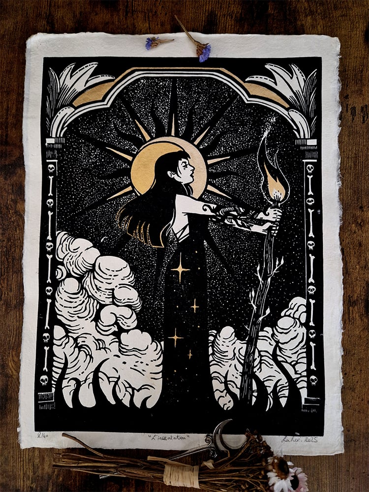 Avis à tous les sorcières et toutes les âmes qui s'enflamment, une nouvelle linogravure pour honorer vos esprits rayonnants ✨
