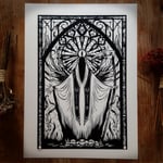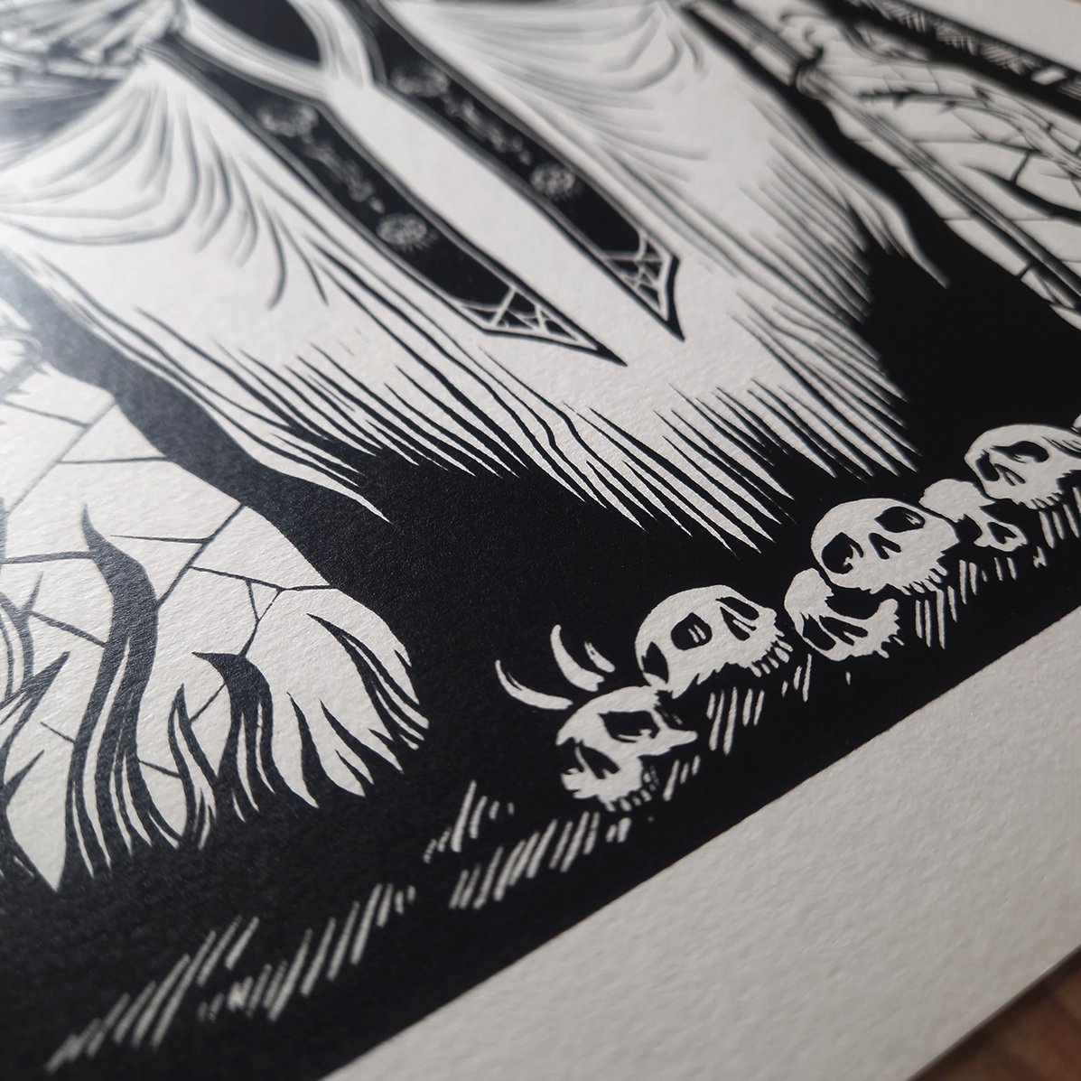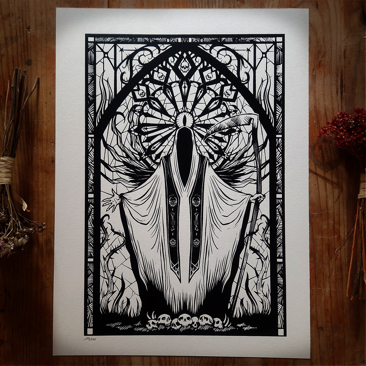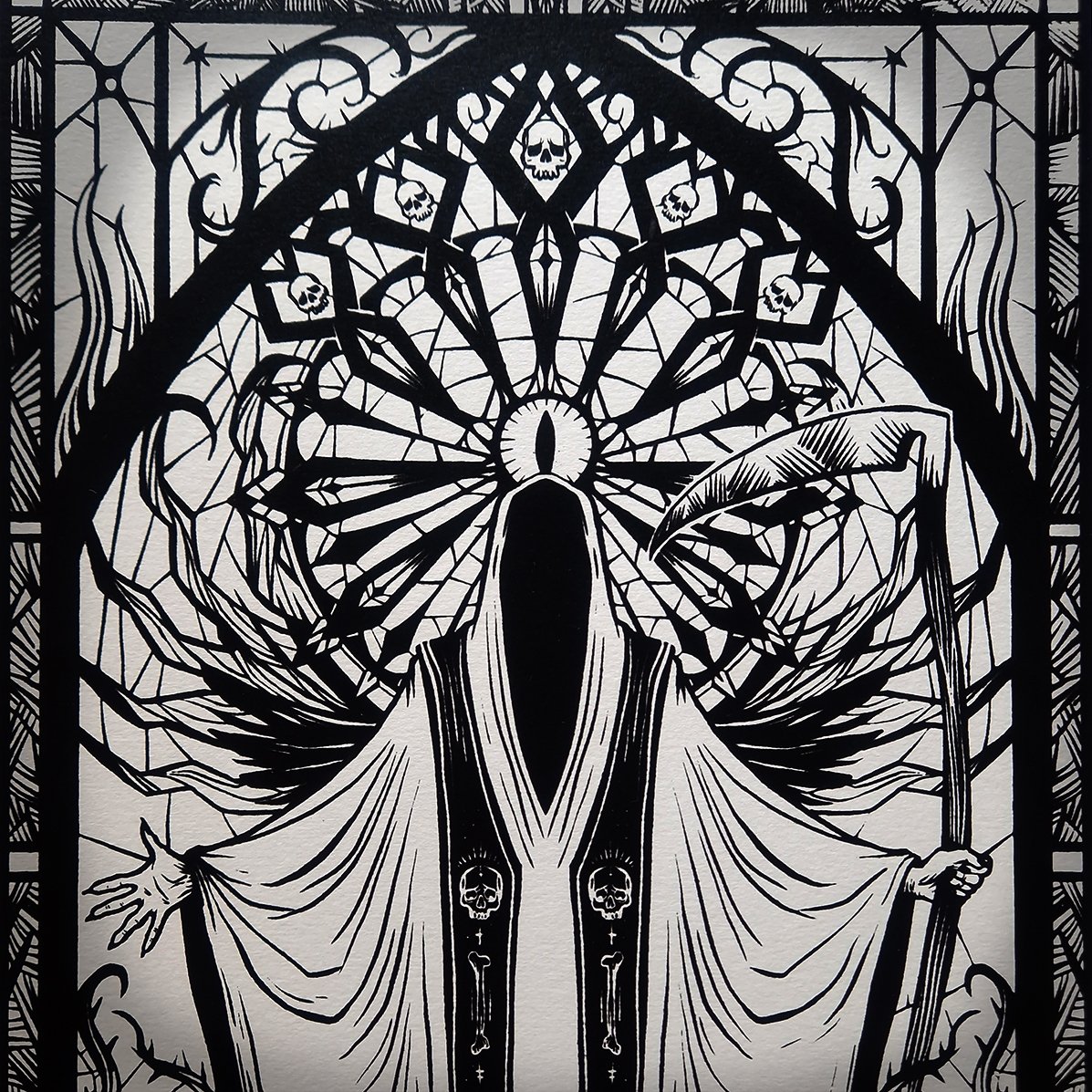 La grande faucheuse, bras ouverts, des crânes à ses pieds, vous accueille dans cette illustration comme un vitrail.